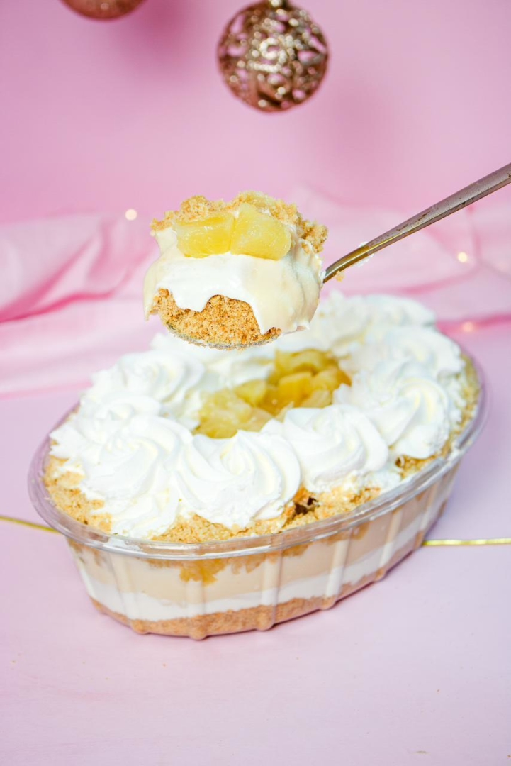 Uma combinação irresistível de farofinha de bolacha amanteigada, creme delícia, brigadeiro branco e camada generosa de abacaxi e chantininho.
