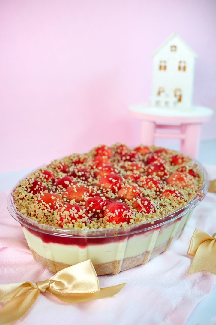 Farofinha de bolacha amanteigada, delicioso creme branco, morangos frescos, finalizada com geleia de brilho e um toque de castanhas.