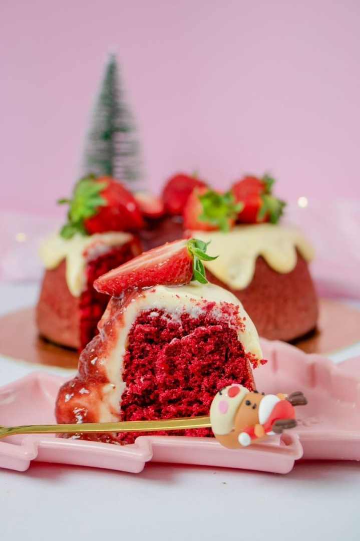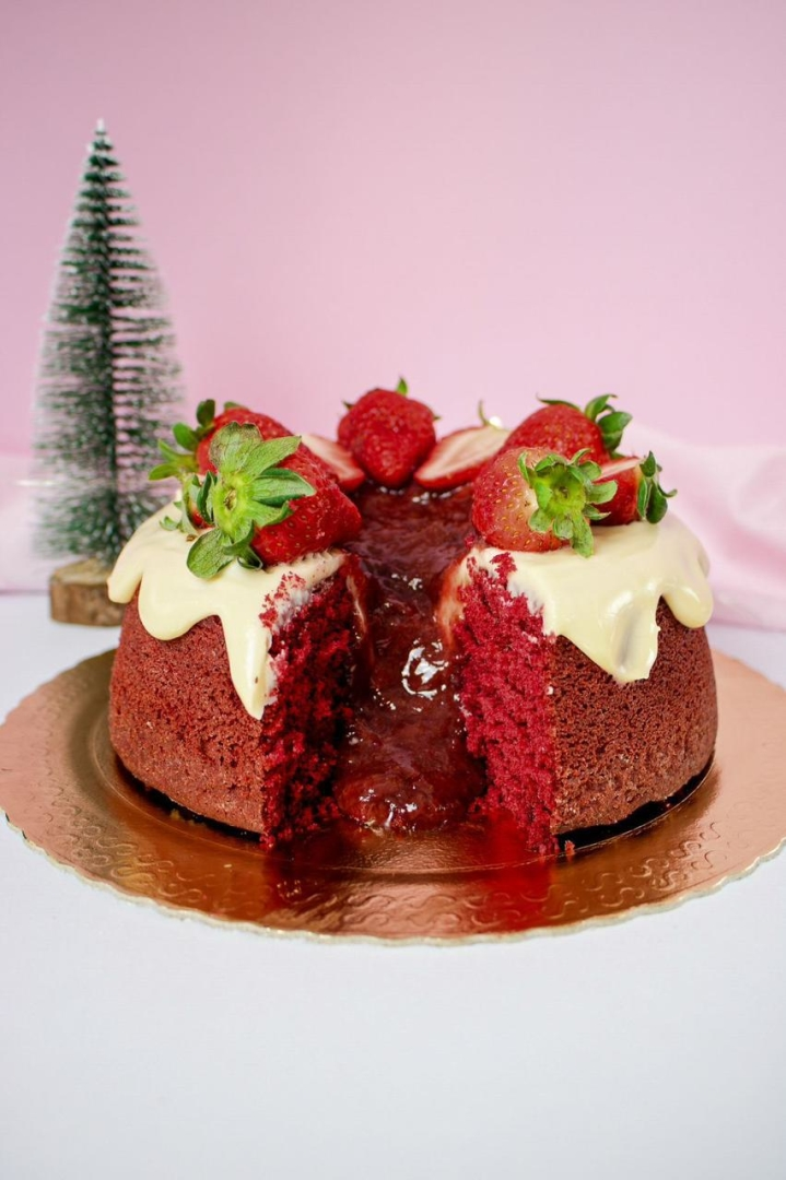 Massa aveludada de Red velvet, cobertura cremosa de ninho, geleia artesanal de morango e decorado com morangos frescos. 1KG