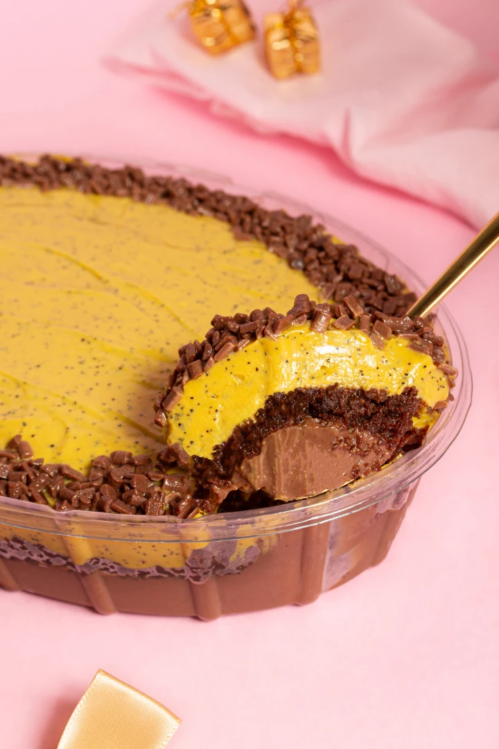 Versão do nosso bolo gelado ninho com brigadeiro. Massa de chocolate, mousse de ninho e brigadeiro trufado de chocolate.