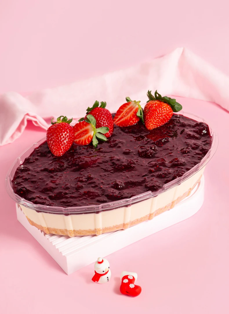 Farofinha de bolacha amanteigada, delicioso creme branco, morangos frescos, finalizada com geleia de brilho e um toque de castanhas.