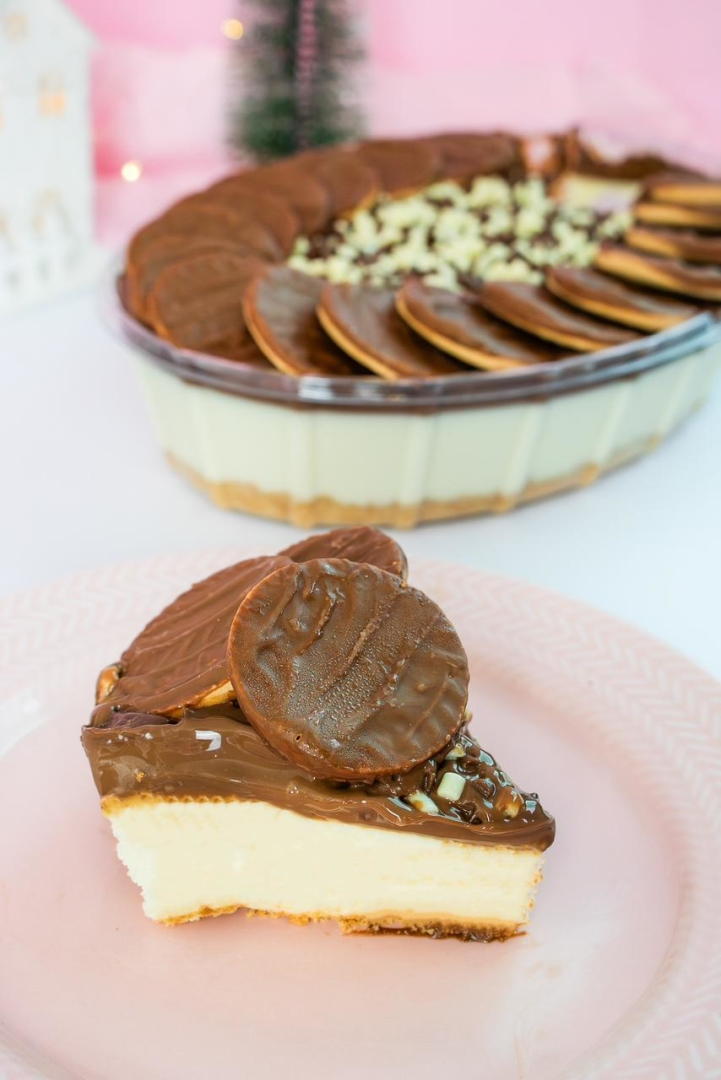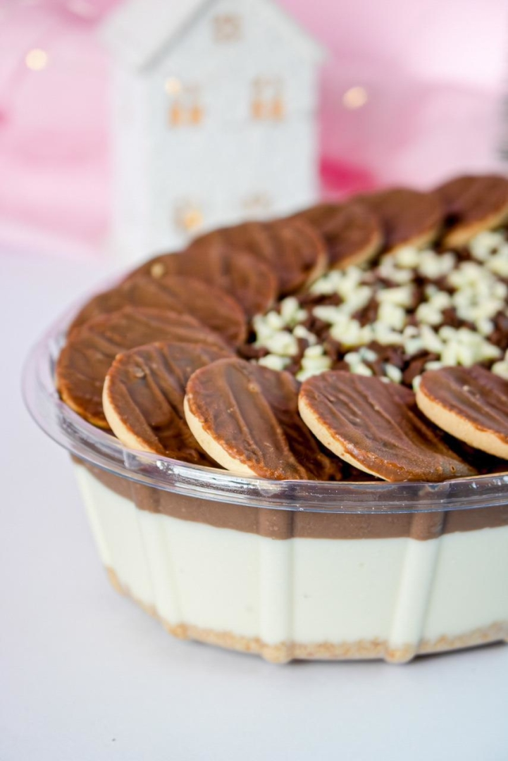 Camadas de creme branco aveludado, bolacha maisena e creme de doce de leite com nozes.