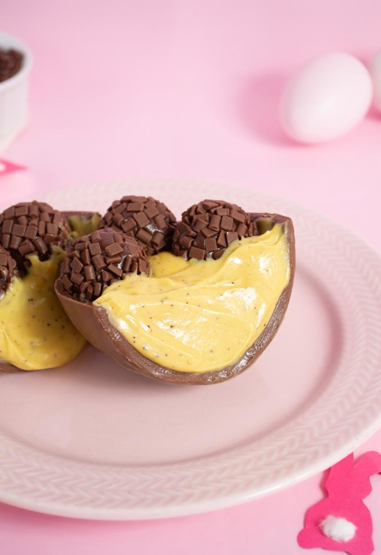 Preparados artesanalmente para deixar sua Páscoa ainda mais especial! Casca de chocolate Nobre ao Leite, recheada com brigadeiro de maracujá e finalizado com docinhos de brigadeiro gourmet. 400g
