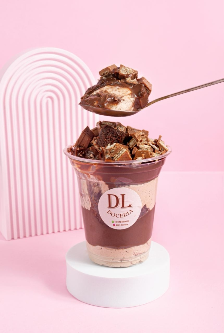 Camadas de Brigadeiro Trufado, Brownie, Mousse de Chocolate e Kitkat.Copo 380ml