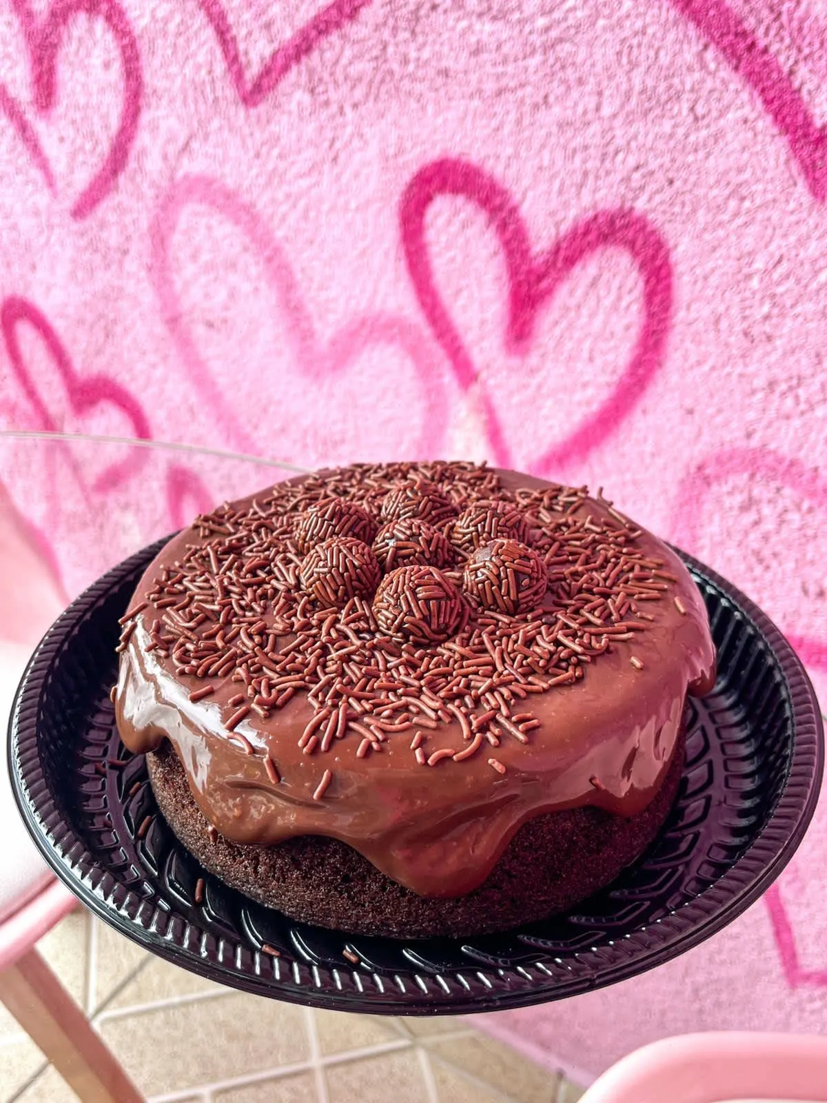 Bolo de chocolate com uma deliciosa cobertura de chocolate cremoso, cobertura de Ninho e decorado com brigadeiros
