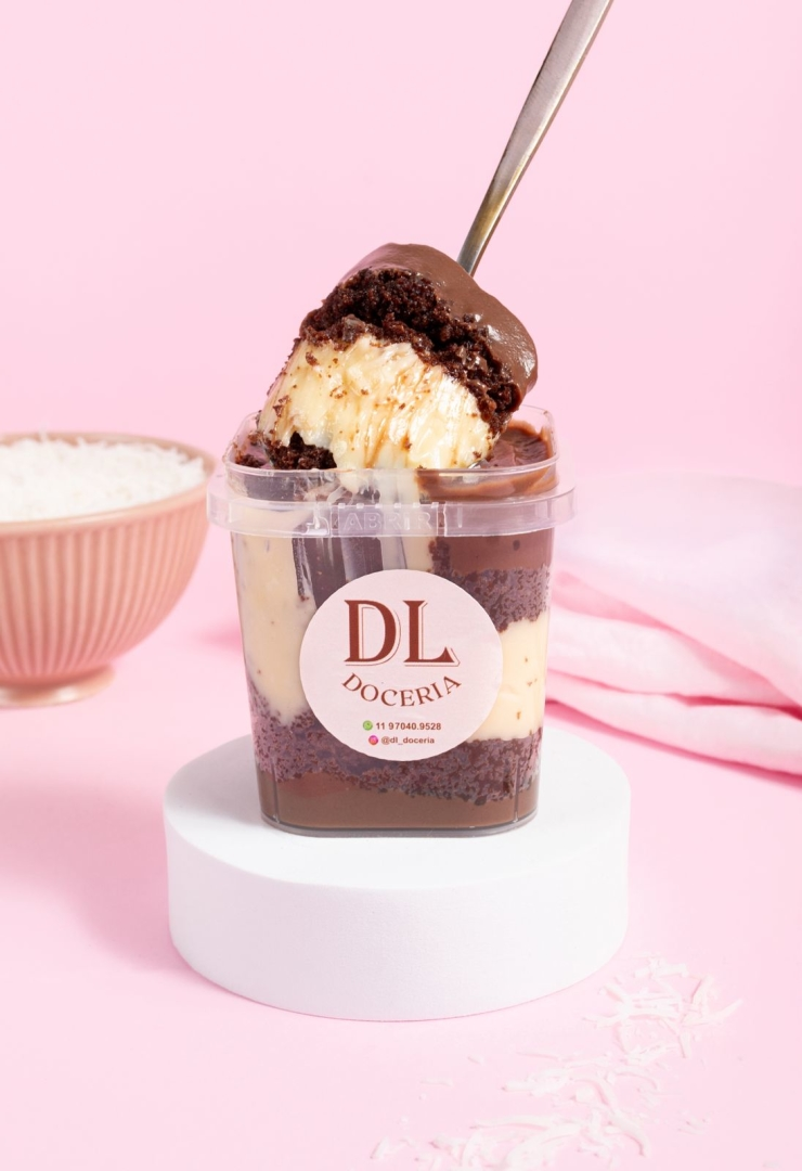 Massa de chocolate com uma deliciosa camada de recheio de brigadeiro de coco e brigadeiro cremoso de chocolate
