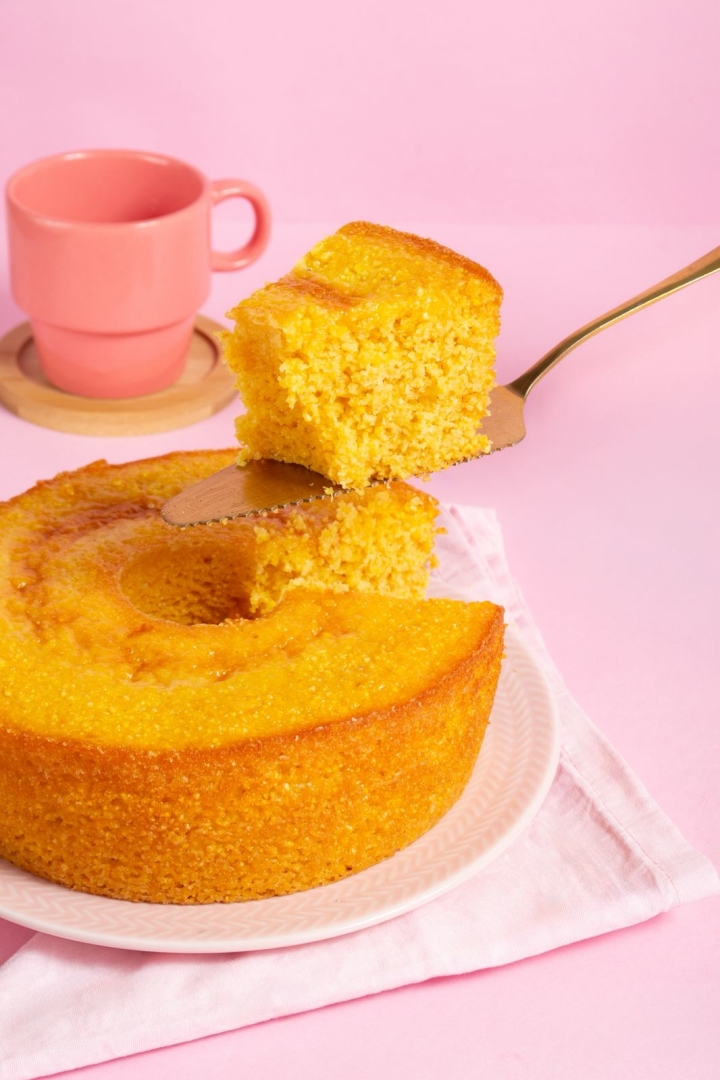 Feito com bananas de verdade, esse bolo tem um toque suave de canela e pedacinhos de fruta que fazem toda a diferença na textura e no sabor. Para finalizar, uma generosa camada de açúcar e canela por cima, levemente crocante — impossível resistir!